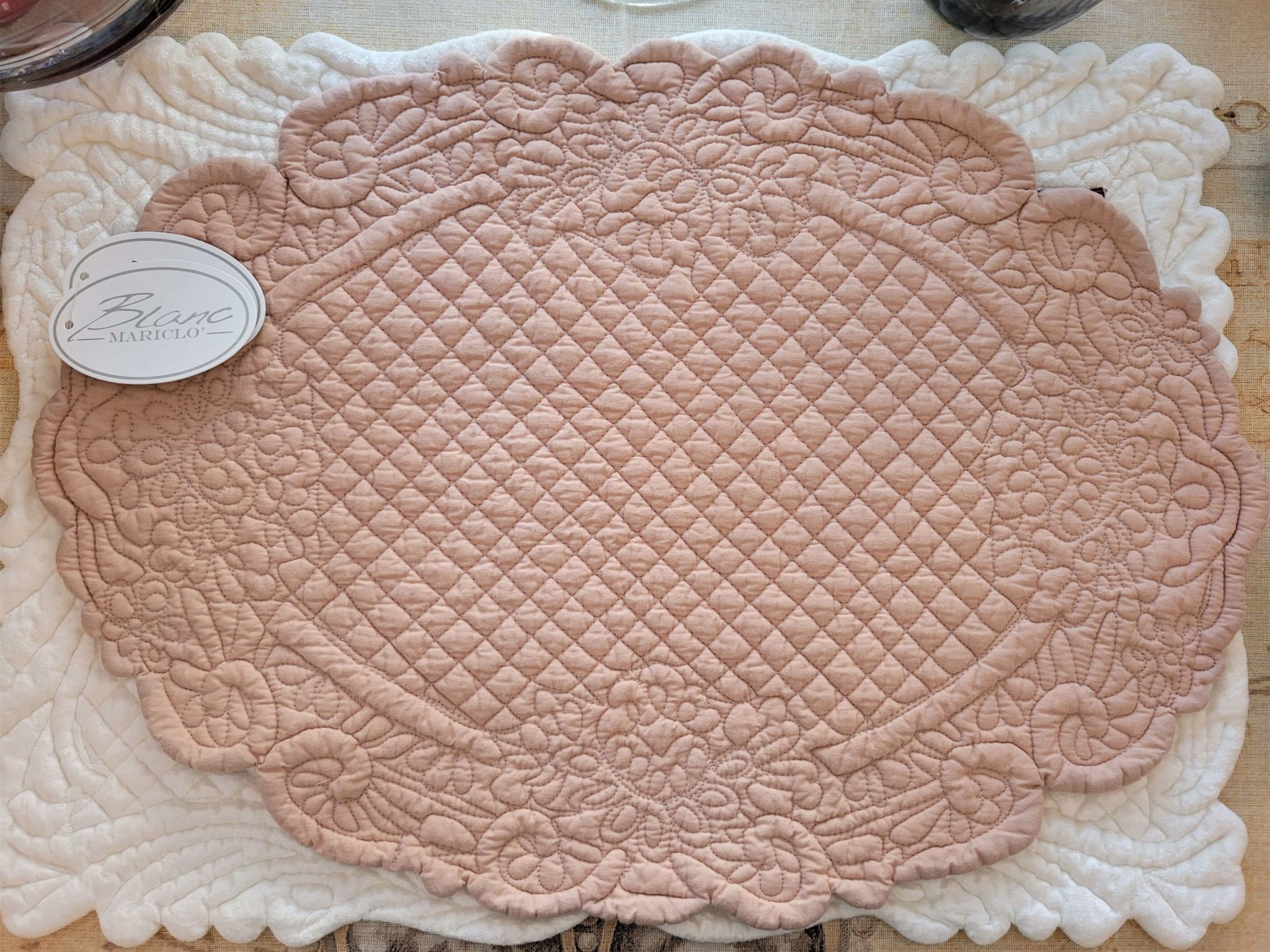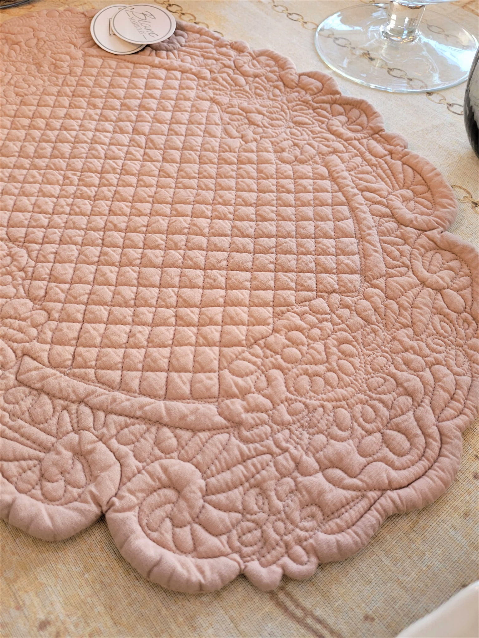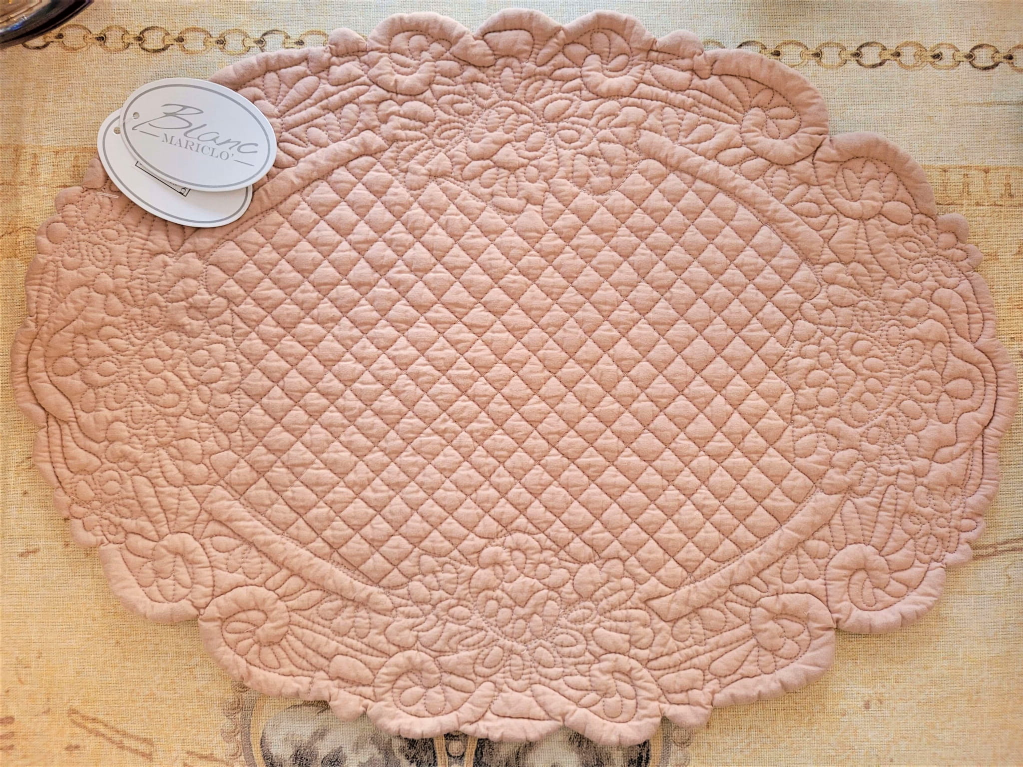 Wprowadź do swojego wnętrza odrobinę włoskiego romantyzmu z podkładką LINDSAY marki Blanc Mariclo. Ta owalna, pikowana podkładka z miękkiej bawełny jest kwintesencją delikatności i elegancji. Staranne przeszycia dodają jej uroku vintage. Użyj jej do ochrony blatu podczas posiłków lub jako bazę pod dekoracje, by stworzyć niezapomniane aranżacje stołu.